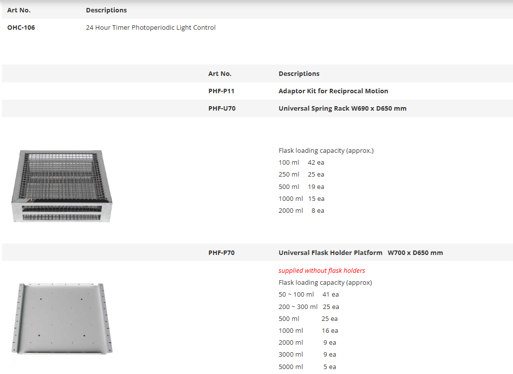 | Art No. | Descriptions | Elec. Req. | Capacity | Net Wt. | Ship Wt. |